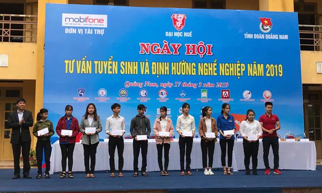 Dịp này, ĐH Huế phối hợp Mobifone trao 10 suất học bổng cho học sinh nghèo vượt khó của các trường THPT trên địa bàn tỉnh Quảng Nam, mỗi suất trị giá 500 nghìn đồng.