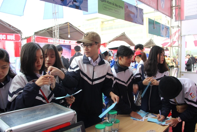 Gian hàng tư vấn tuyển sinh của Phân hiệu ĐH Huế tại Quảng Trị cũng thu hút đông đảo học sinh
