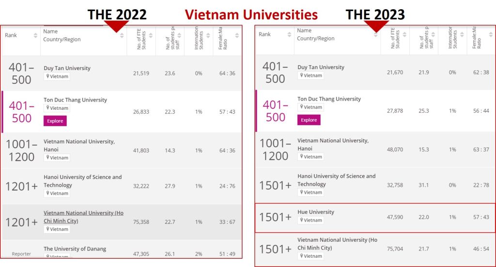 Việt Nam có 6 cơ sở giáo dục đại học (CSGDĐH) được xếp hạng trong bảng xếp hạng ĐH thế giới THE 2023, trong đó 5 đơn vị (Trường ĐH Duy Tân, Trường ĐH Tôn Đức Thắng, ĐH Quốc gia Hà Nội, ĐH Quốc gia TP. Hồ Chí Minh và Trường ĐH Bách khoa Hà Nội) đã có từ THE 2022, ĐH Huế là đơn vị mới.
