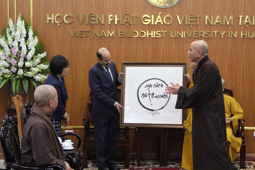 Các vị Trưởng lão Hòa thượng: Thích Quang Nhuận -Thành viên Hội đồng Chỉ đạo Học viện; Thích Hải Ấn, UVTT HĐTS GHPGVN, Viện trưởng Học viện PGVN tại Huế; Thượng tọa-Tiến sĩ (TT-TS) Thích Nguyên Thành, UV HĐTS GHPGVN, Phó Trưởng Ban GDPG TƯ, Phó Trưởng Ban Phật giáo Quốc tế TƯ, Phó Viện trưởng Thường trực Học viện cùng chư Tôn đức Phó Viện trưởng và Hội đồng Điều hành Học viện đã đón tiếp ngài Đại sứ và đoàn cùng đi.