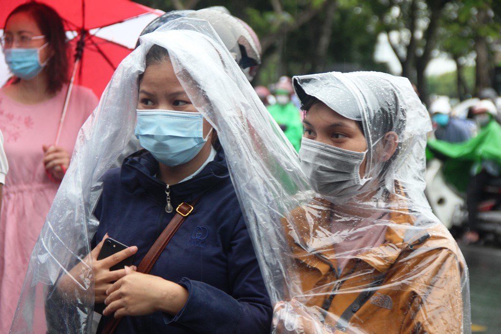 Phụ huynh đội mưa đứng ngóng con ở bên ngoài trường thi