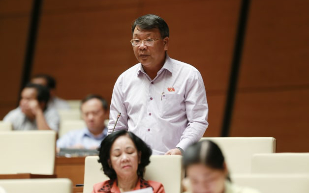 Đại biểu Phạm Văn Hoà phát biểu trên hội trường sáng 21/5. Ông đề nghị dự thảo có khoản giao Chính phủ nghiên cứu về bỏ thi tốt nghiệp THPT