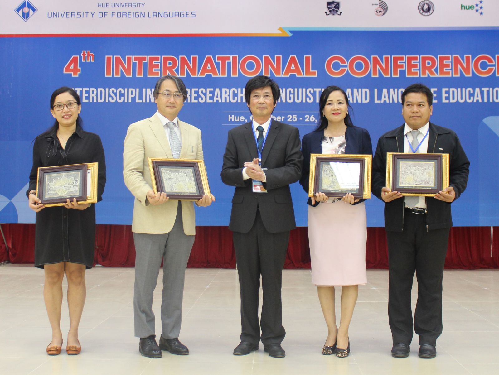 Hiệu trưởng Trường Đại học Ngoại ngữ - Đại học Huế trao chứng nhận và quà lưu niệm cho các đơn vị phối hợp tổ chức hội thảo