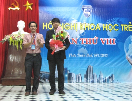 PGS.TS.Hoàng Văn Hiển, Phó Hiệu trưởng Trường đại học Khoa học, trao thưởng cho Th.S Phan Tuấn Anh, đạt giải Nhất Giải thưởng tài năng khoa học trẻ Việt Nam năm 2012.