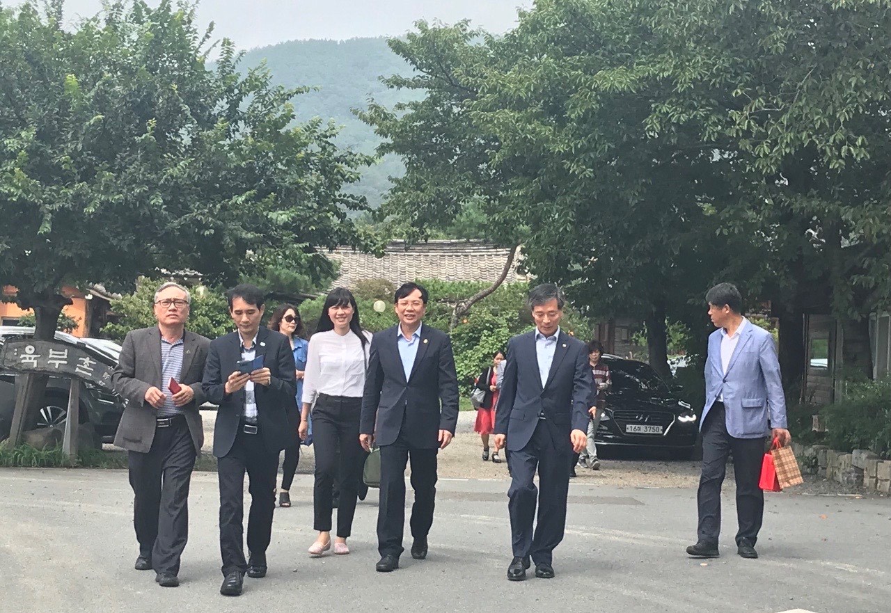 Trang (áo trắng) phiên dịch tại buổi làm việc của đoàn Hội nhà Báo Việt Nam tại Hàn Quốc