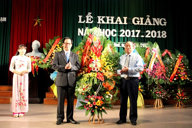 Ông Nguyễn Văn Cao, Phó Bí thư Tỉnh ủy, Chủ tịch UBND tỉnh tặng hoa chúc mừng nhà trường