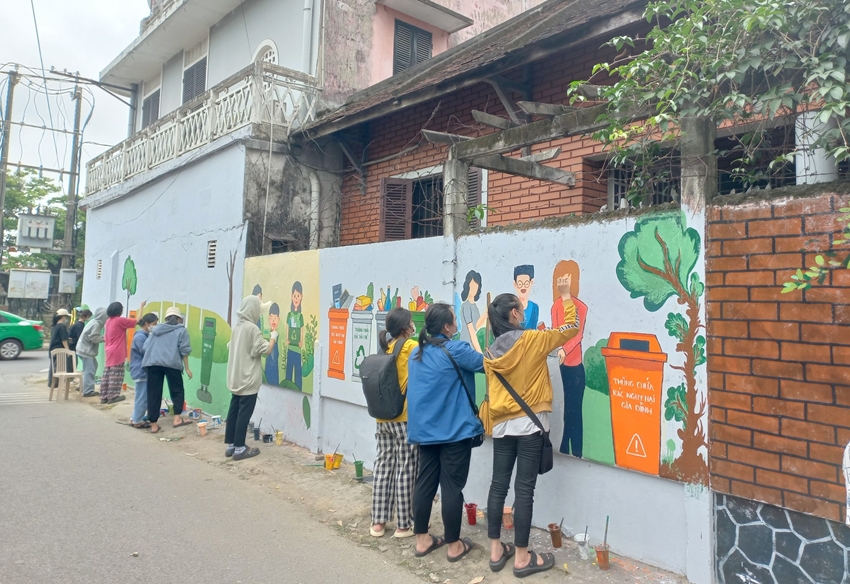 | Cán bộ, sinh viên Trường ĐH Nghệ thuật tham gia vẽ tranh bích hoạ, tranh trang trí tuyên truyền bảo vệ môi trường ở các tuyến phố |