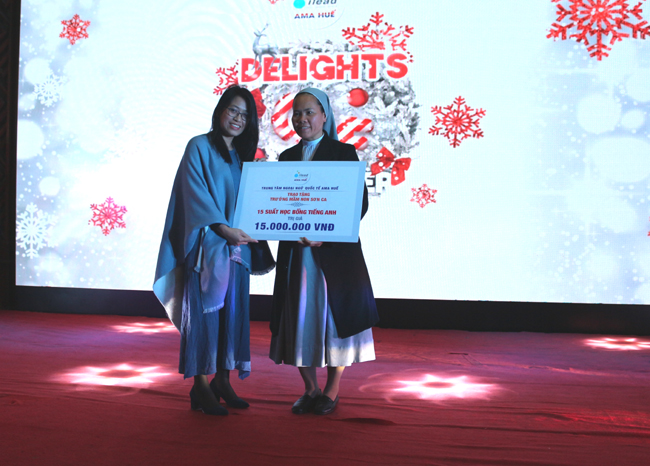 Với thông điệp sẻ chia và lan tỏa yêu thương, AMA Huế còn trao học bổng tiếng Anh cho 35 em học sinh có hoàn cảnh khó khăn đến từ 3 Trường mầm non Sơn Ca, mầm non Hoa Mai và Trường tiểu học Vĩnh Ninh, với tổng trị giá lên đến 37.800.000 đồng nhằm tạo điều kiện giúp các bạn được học tiếng Anh trong môi trường chuyên nghiệp.