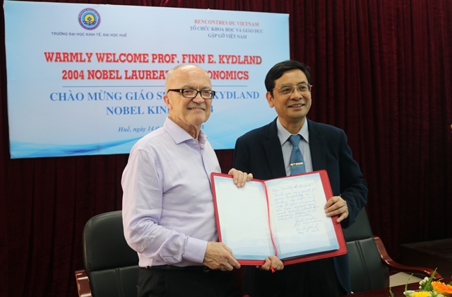* Trước đó, GS. Finn E. Kydland đã có chuyến thăm và làm việc tại Trường ĐH Kinh tế - ĐH Huế. Đại diện nhà trường đã giới thiệu một số thông tin về Trường ĐH Kinh tế Huế và mời GS. Finn E. Kydland ghi vào sổ lưu niệm của trường.