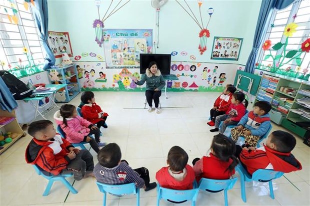 Một buổi học lớp ghép 2 + 3 + 4 tuổi của điểm trường Lũng Slàng thuộc trường Mầm non xã Tri Phương (Tràng Định, Lạng Sơn). Ảnh: TTXVN phát
