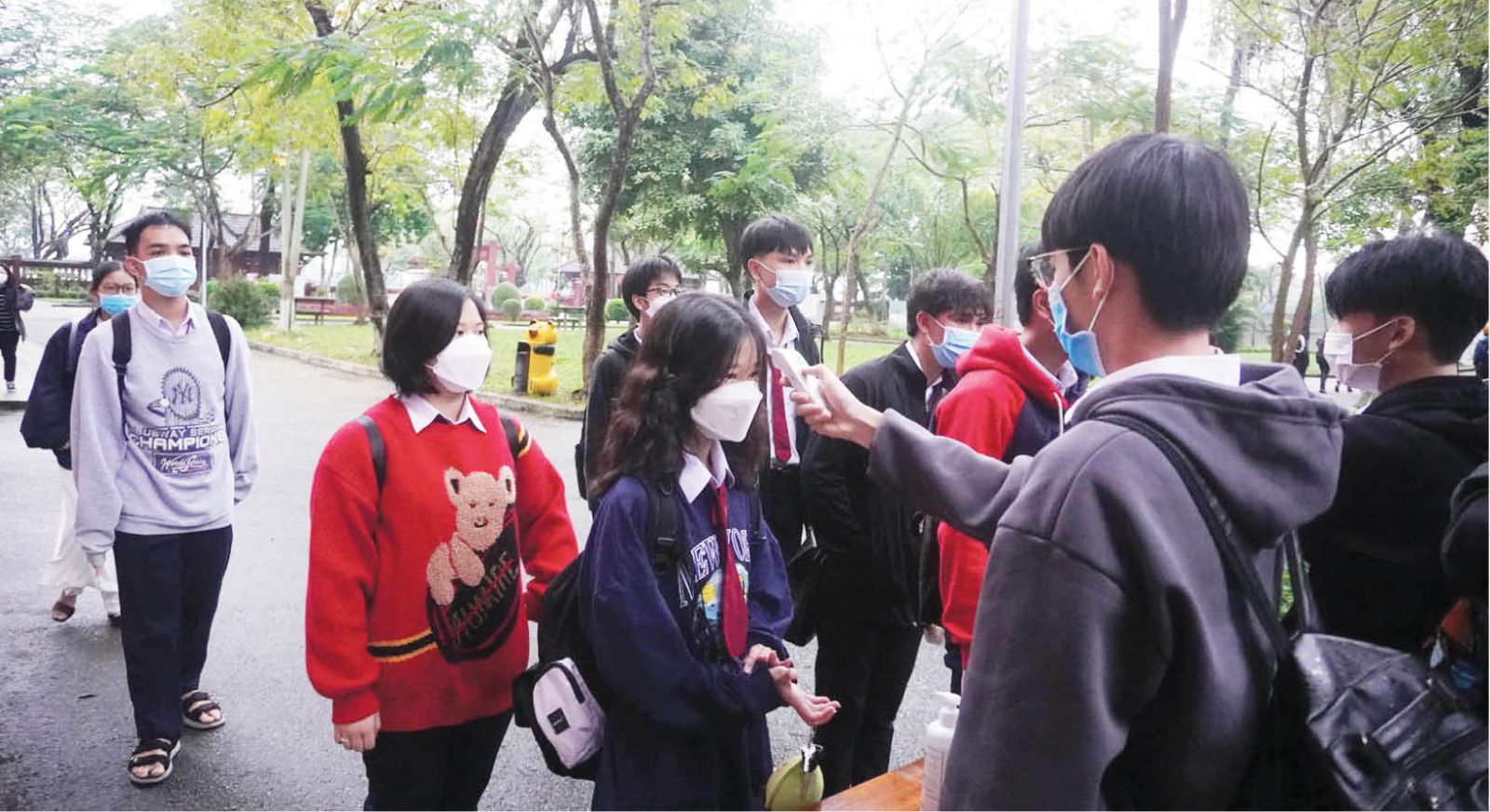 Đo thân nhiệt cho học sinh ở Trường THPT Hai Bà Trưng