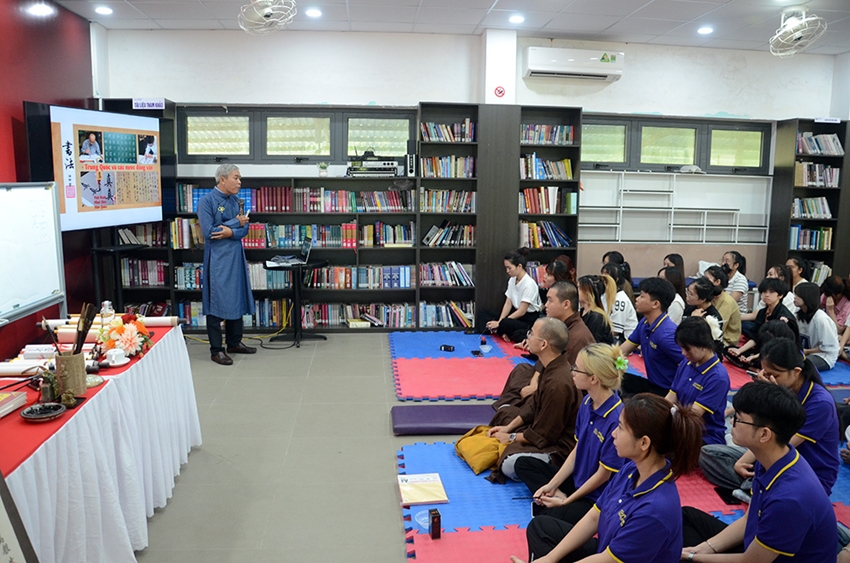 | Sinh viên lắng nghe diễn giả chia sẻ về nghệ thuật thư pháp |