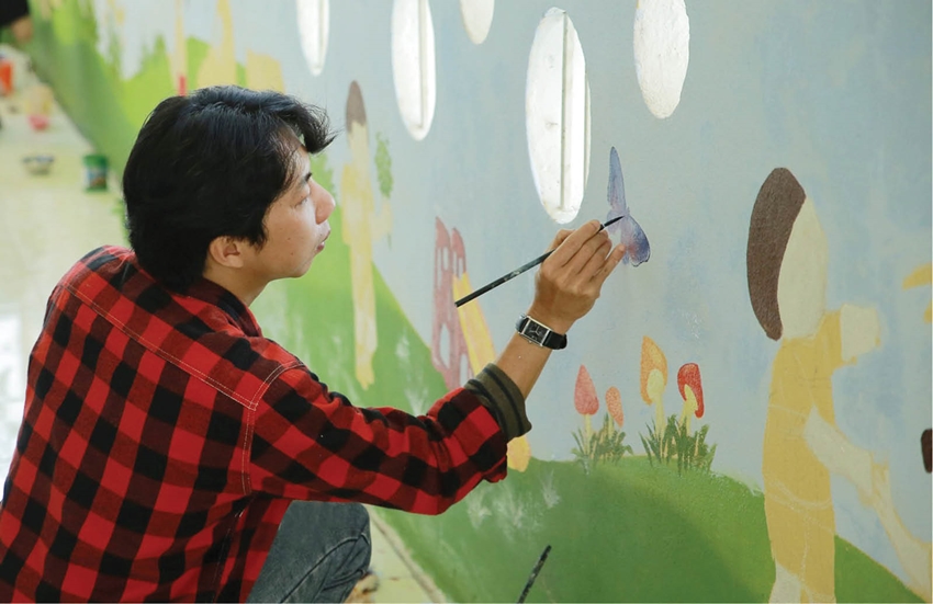 | Đoàn viên, sinh viên Khoa Kiến trúc, Trường ĐH Khoa học vẽ trang trí tranh tường ở Trường mầm non Hương Chữ |