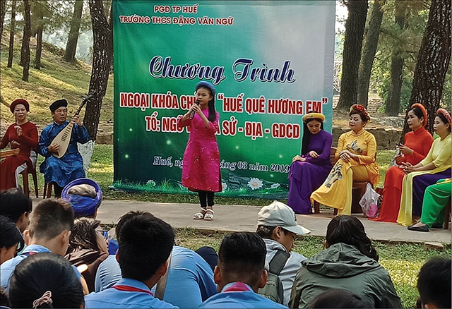 Câu lạc bộ ca Huế giao lưu cùng học sinh trong hoạt động đưa ca Huế vào trường học. Ảnh: KO