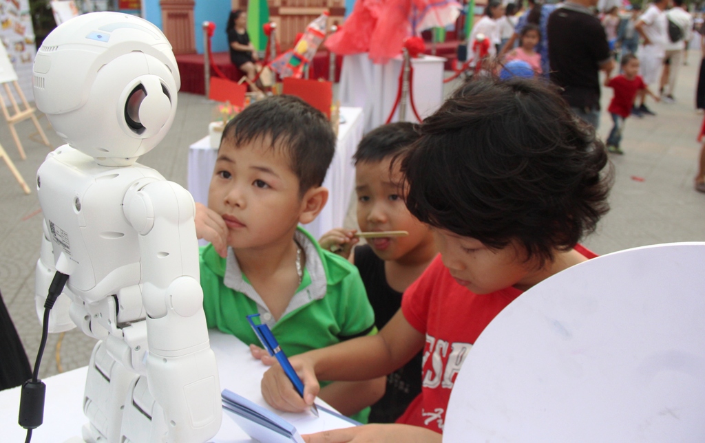 Nhiều em nhỏ tỏ ra thích thú với chú robot được trưng bày tại ngày hội