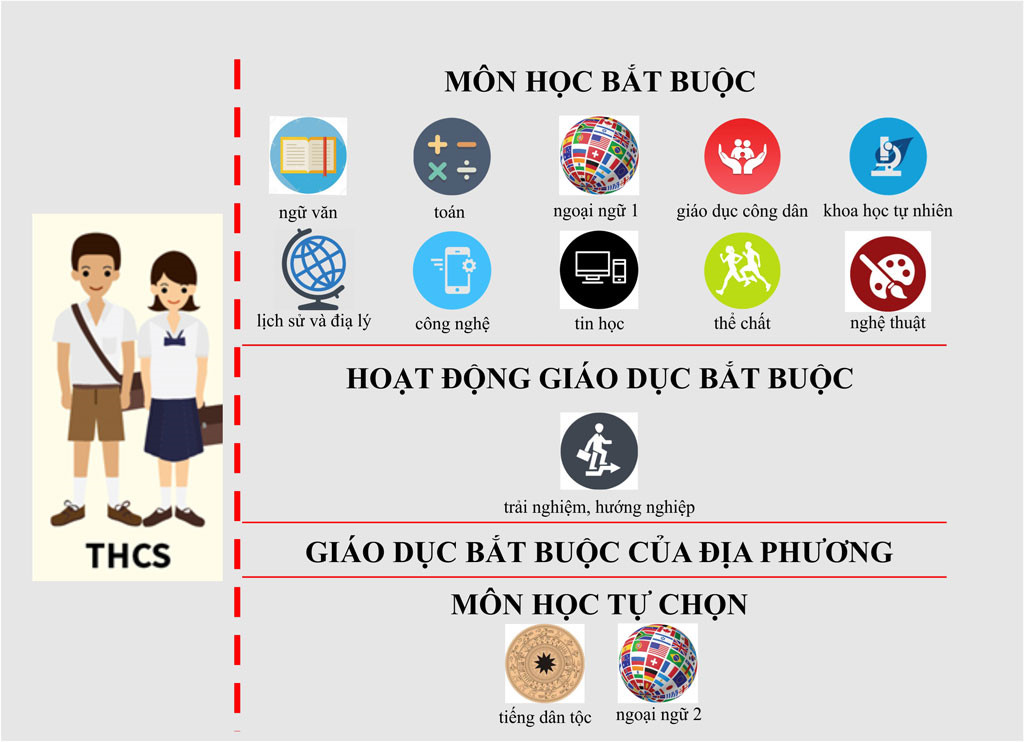 Các môn học và hoạt động giáo dục bắt buộc (xem đồ họa). Mỗi môn học công nghệ, tin học, giáo dục thể chất được thiết kế thành các học phần; hoạt động trải nghiệm, hướng nghiệp được thiết kế thành các chủ đề; học sinh được lựa chọn học phần, chủ đề phù hợp với nguyện vọng của bản thân và khả năng tổ chức của nhà trường.