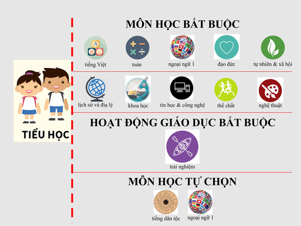 Các môn ở cấp tiểu học (xem đồ họa). Nội dung môn học giáo dục thể chất được thiết kế thành các học phần (mô đun); nội dung hoạt động trải nghiệm được thiết kế thành các chủ đề; học sinh được lựa chọn học phần, chủ đề phù hợp với nguyện vọng của bản thân và khả năng tổ chức của nhà trường. Các môn học tự chọn ở cấp học này gồm tiếng dân tộc thiểu số, ngoại ngữ 1 (ở lớp 1, lớp 2).