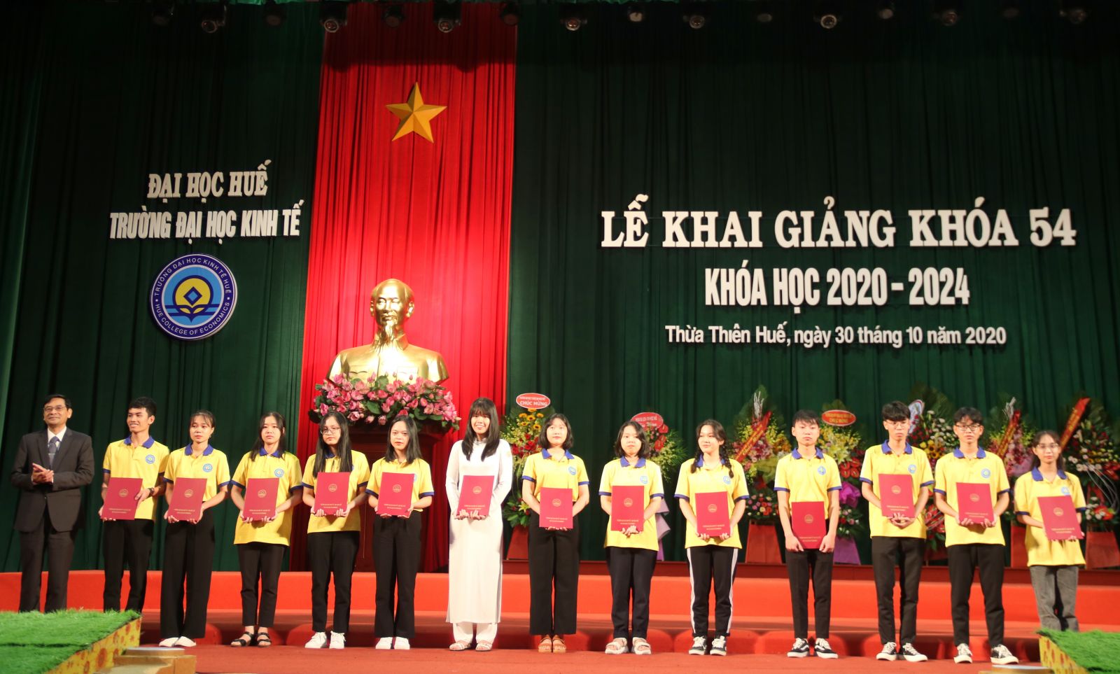 Đợt này, Trường ĐH Kinh tế khen thưởng 13 tân sinh viên khoá 54 đạt từ 26 điểm trở lên và 192 tân sinh viên đạt từ 24 - 26 điểm trong kỳ thi tuyển sinh vào trường, đồng thời trao học bổng của các doanh nghiệp cho 1 tân sinh viên đạt thủ khoa khoá 54 và 32 sinh viên đạt điểm cao của các khoa trong kỳ thi tuyển sinh ĐH hệ chính quy năm 2020.