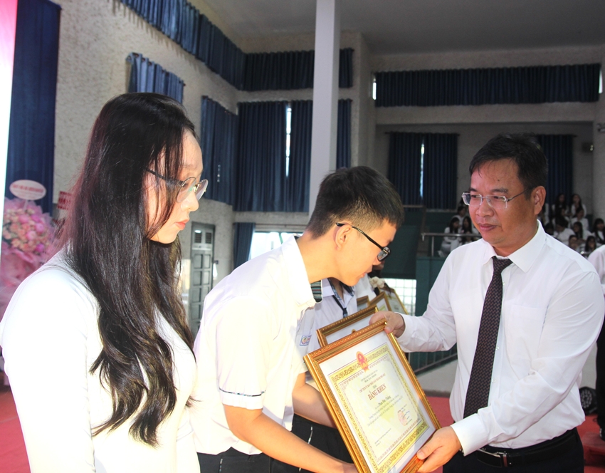 | Bí thư Thành ủy Lê Trường Lưu và Chủ tịch UBND TP. Huế Nguyễn Văn Phương tặng Bằng khen cho các học sinh có thành tích cao của Trường THPT Chuyên Quốc Học Huế |