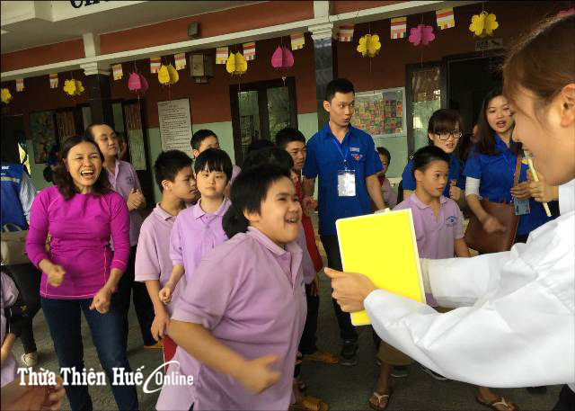 Sáng 10/1, Trường trẻ em khuyết tật Thuỷ Biều đón nhận một tin vui: Đoàn sinh viên tình nguyện Hàn Quốc và sinh viên Trường đại học Kinh tế Huế đến chơi. Từ đầu giờ sáng, vẻ háo hức đã hiện rõ trên khuôn mặt ngây thơ của các em nhỏ. Hơn 9h, xe chở đoàn sinh viên tình nguyện Hàn Quốc dừng chân trước cổng trường trong tiếng vỗ tay hoan hô nhiệt tình của các em.