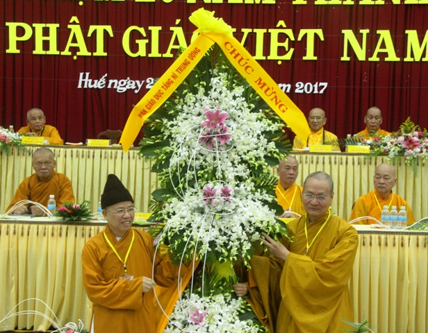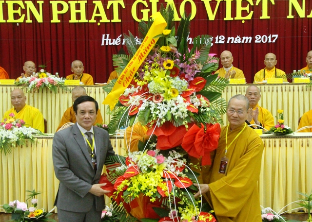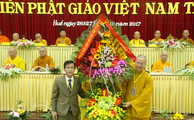 Phó Chủ tịch UBND tỉnh Nguyễn Văn Phương tặng hoa chúc mừng Học viện Phật giáo Việt Nam tại Huế