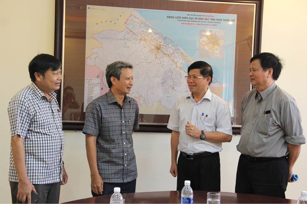 Bí thư Tỉnh ủy Lê Trường Lưu cùng các đại biểu trao đổi với Giám đốc Sở GD&ĐT Phạm Văn Hùng bên lề buổi làm việc