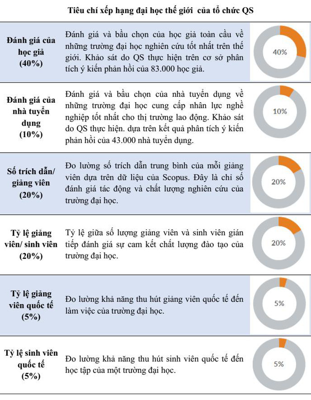 Phân tích về bảng xếp hạng đại học thế giới của tổ chức QS, Nguyễn Hữu Đức, Phó giám đốc ĐH Quốc gia Hà Nội cho biết, so sánh với bảng xếp hạng QS khu vực Châu Á mà mấy năm gần đây một số cơ sở giáo dục đại học đã có mặt đến top 150, các tiêu chí xếp hạng thế giới nghiêng nhiều về trọng số nghiên cứu.