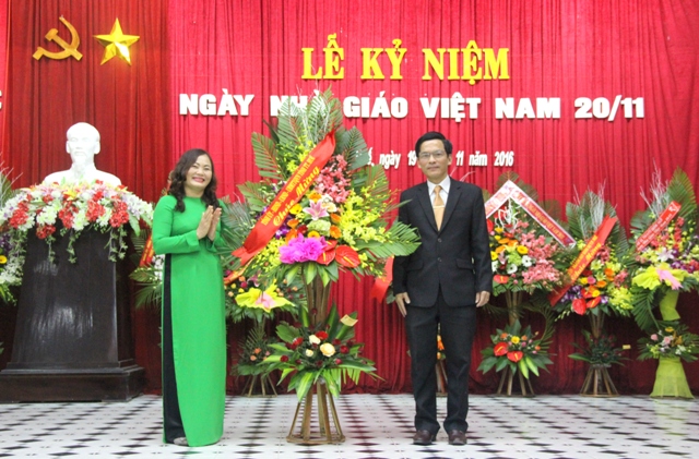 Bà Đoàn Thị Thanh Huyền, UVTV Tỉnh ủy, Trưởng Ban Tổ chức Tỉnh ủy tặng hoa chúc mừng nhà trường