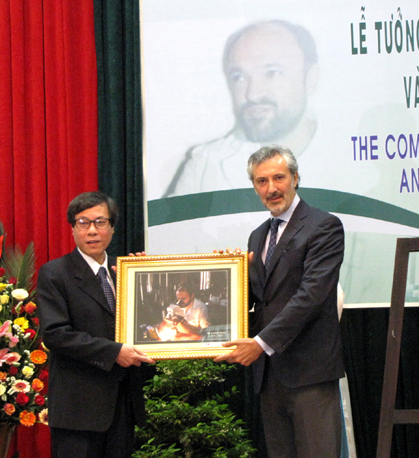 | Đại sứ Ý tại Việt Nam - Lorenzo Angeloni (bên phải) trao tặng bức ảnh bác sĩ Carlo Urbani cho Trường đại học Y Dược Huế |