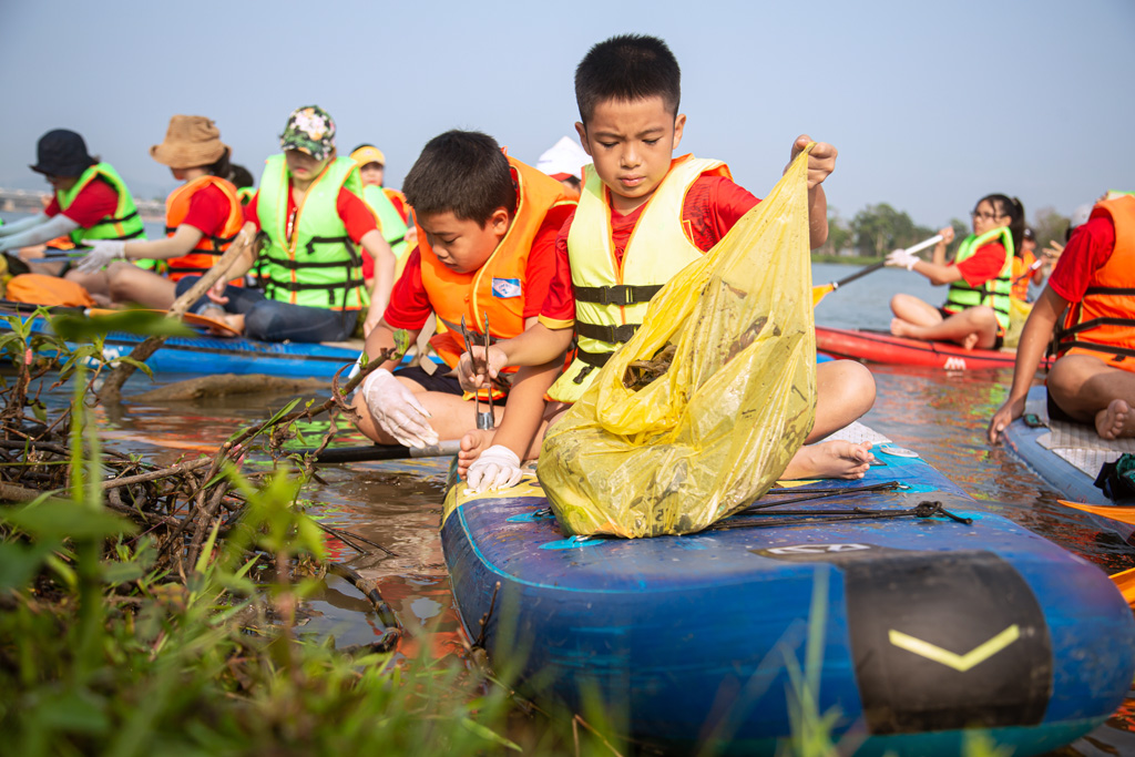 Các thành viên đã đi thuyền SUP và tiến hành nhặt rác, làm sạch hai bên bờ sông Hương đoạn từ cầu Trường Tiền đến cầu Dã Viên.
