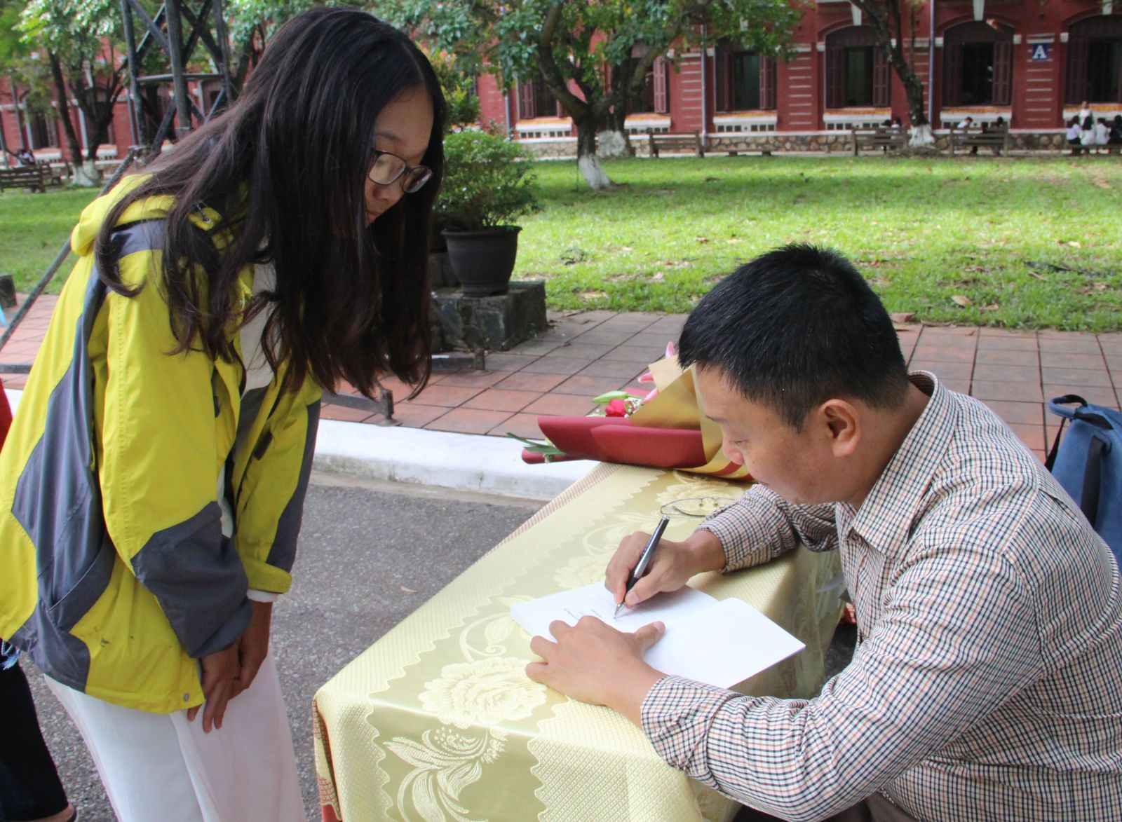 Thầy Nguyễn Thành Nhân ký tặng sách cho học sinh