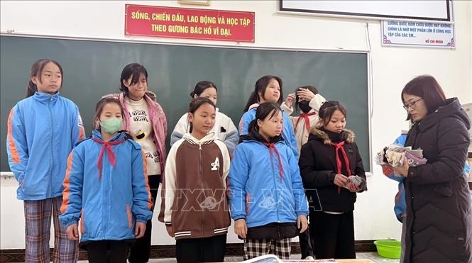 | Tất được chuyển tới tay các bạn học sinh khối THCS. Ảnh: TTXVN phát |