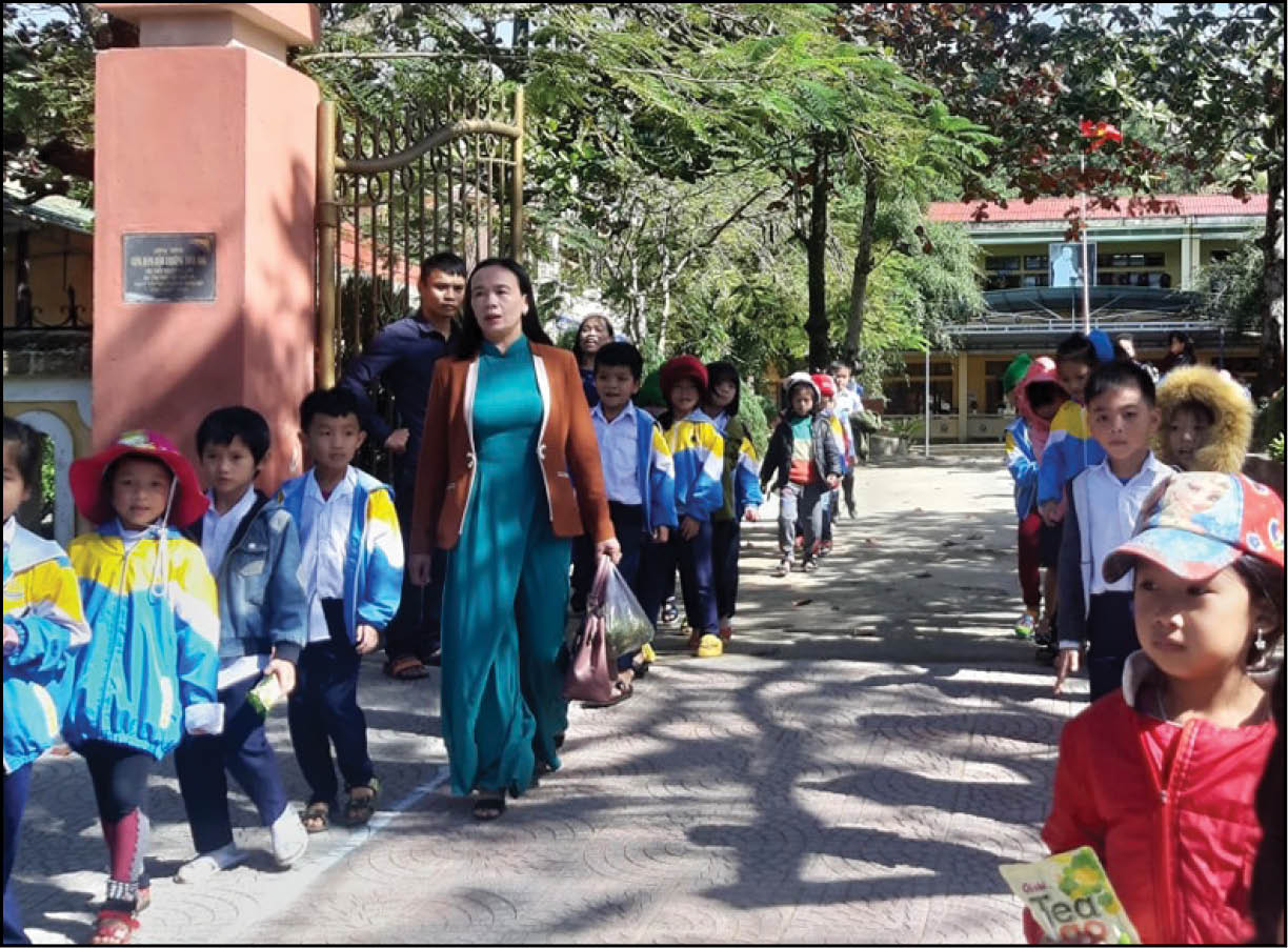 Giáo viên Trường tiểu học Sơn Thủy hướng dẫn học sinh qua đường đúng hàng