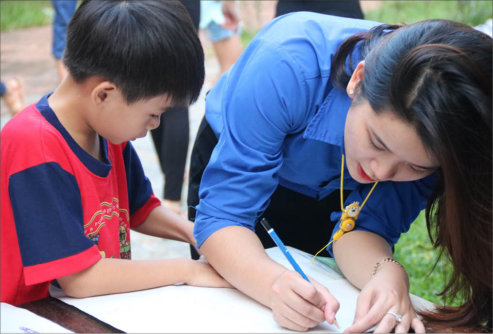 Sinh viên Trường ĐH Khoa học, ĐH Huế hướng dẫn trẻ em ở Làng trẻ em SOS Huế vẽ tranh