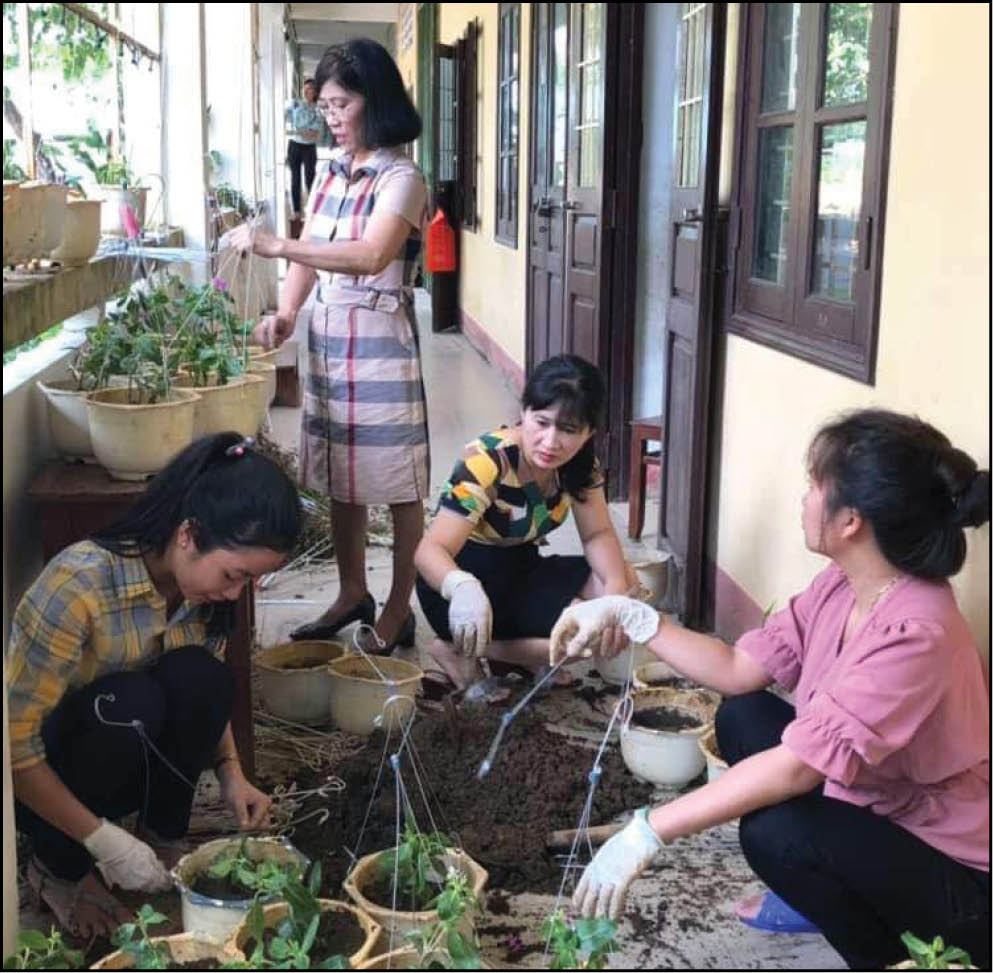 Đoán được thắc mắc của tôi, cô Hòa giải thích: “Để giảm chi phí, chúng tôi huy động cán bộ giáo viên, nhân viên (CBGVNV) và phụ huynh hỗ trợ cây, rồi tự nhân giống để trao đổi nên không chỉ hệ thống cây xanh của trường ngày một phong phú, mà hầu hết CBGVNV ai cũng có vườn hoa riêng tại nhà”.