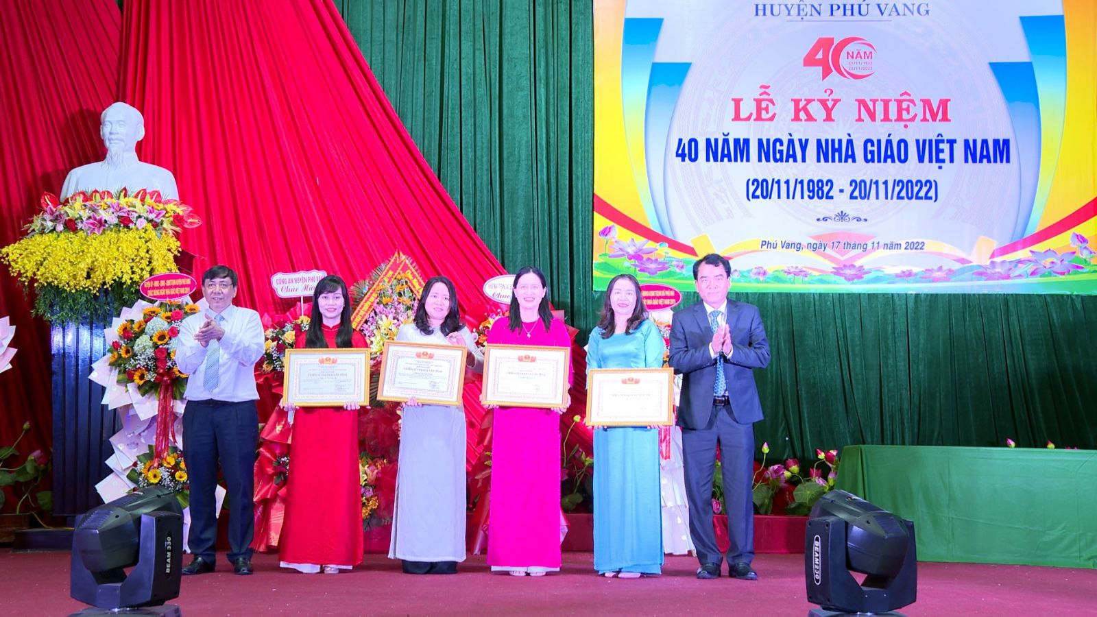 *Chiều cùng ngày, UVTV Tỉnh uỷ, Bí thư Thành uỷ Phan Thiên Định; Phó Bí thư Thường trực Thành uỷ Trần Hùng Nam; Chủ tịch UBND TP. Huế Võ Lê Nhật; lãnh đạo TP. Huế và Sở Giáo dục và Đào tạo (GD&ĐT) cùng quý thầy cô giáo là cán bộ quản lý các trường học và Phòng GD&ĐT, các nhà giáo ưu tú, giáo viên tiêu biểu đã nghỉ hưu và hiệu trưởng, phó hiệu trưởng các trường trên địa bàn TP. Huế cùng dự lễ kỷ niệm 40 năm Ngày Nhà giáo Việt Nam.