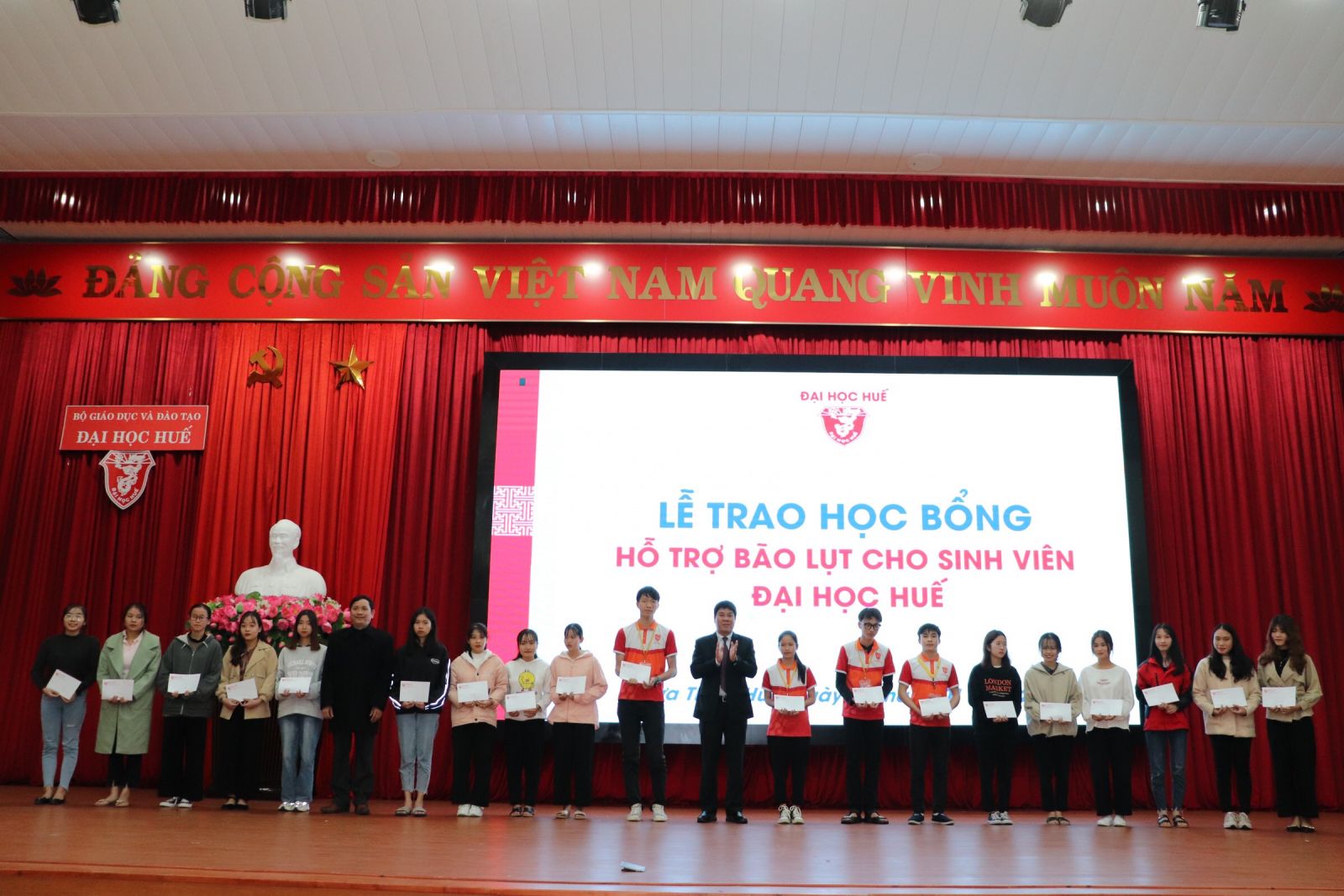 Đợt này, ĐH Huế trao 20 suất học bổng, mỗi suất trị giá 3 triệu đồng cho các sinh viên có hoàn cảnh khó khăn, bị ảnh hưởng do thiên tai, bão lụt; 20 suất học bổng hỗ trợ sinh viên bị ảnh hưởng bão lụt của Hội Sinh viên Việt Nam tại Thái Lan và công ty kết nối Đông Nam Á (mỗi suất 300 nghìn đồng).