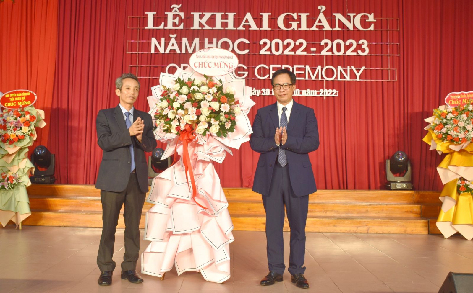 Ông Hoàng Khánh Hùng, UVTV Tỉnh ủy, Trưởng ban Tuyên giáo Tỉnh ủy tặng hoa chúc mừng nhà trường