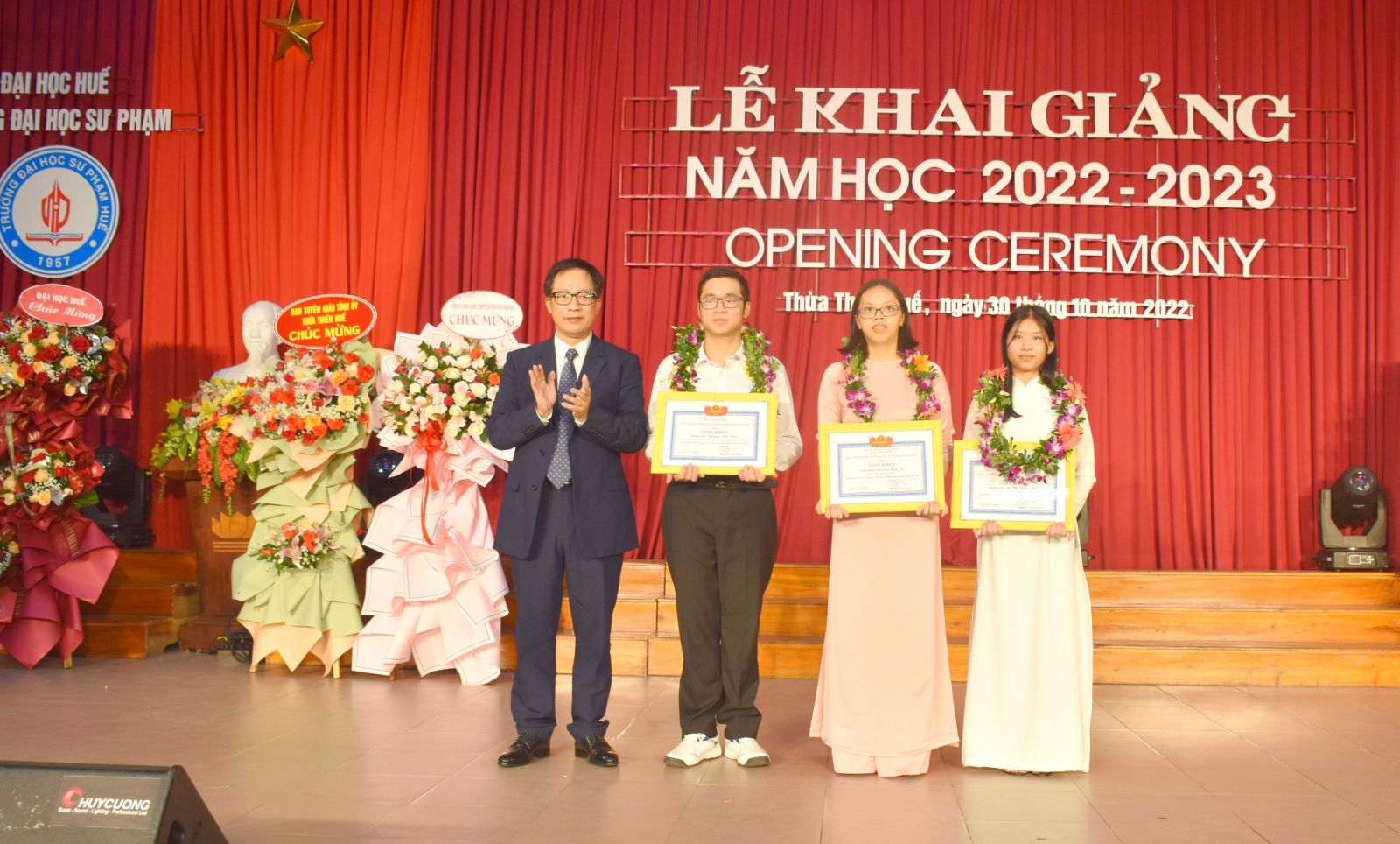 PGS.TS. Lê Anh Phương, Giám đốc ĐH Huế, Hiệu trưởng Trường ĐH Sư phạm tkhen thưởng 3 tân thủ khoa