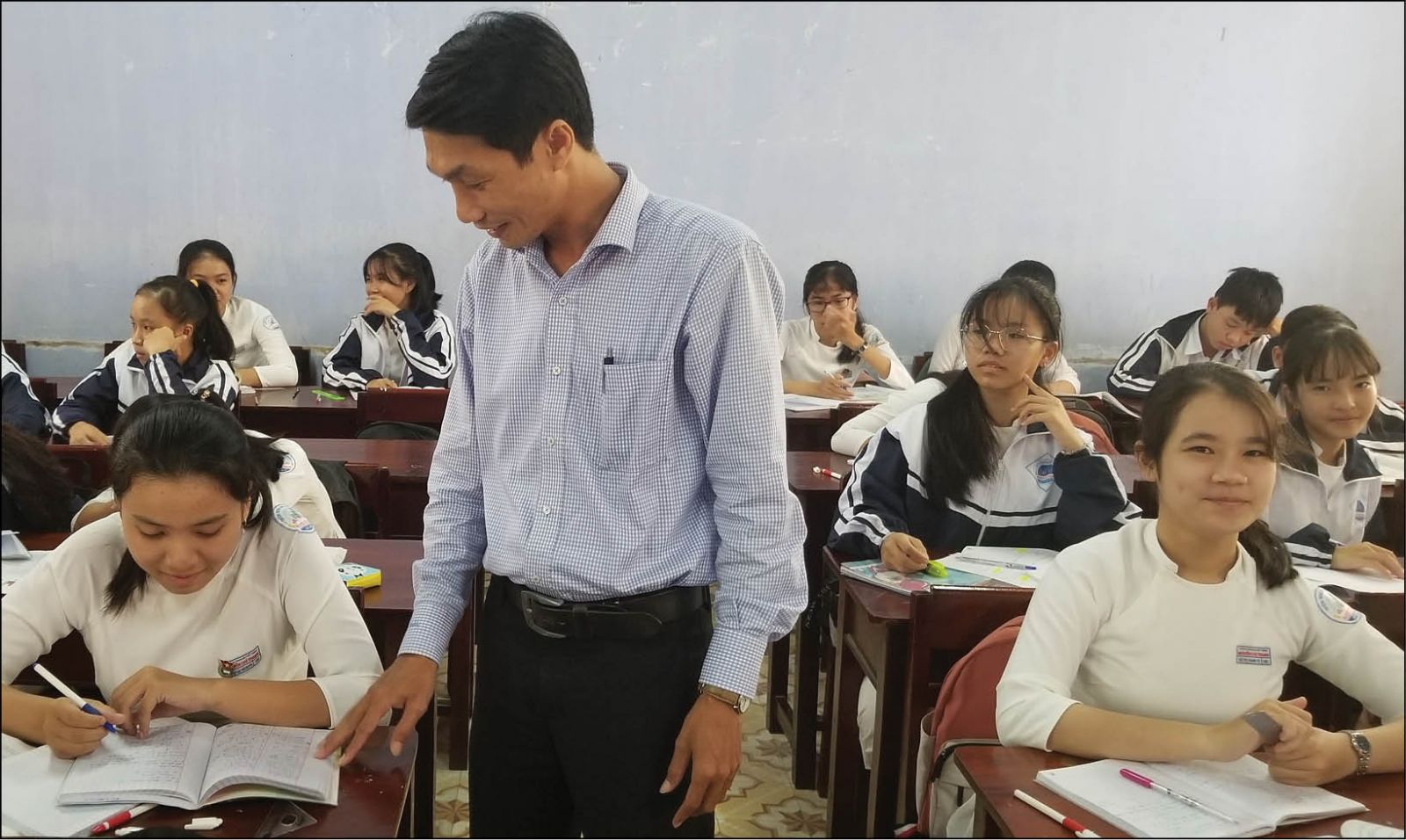 Thầy Trần Dũng trao đổi bài tập với học sinh