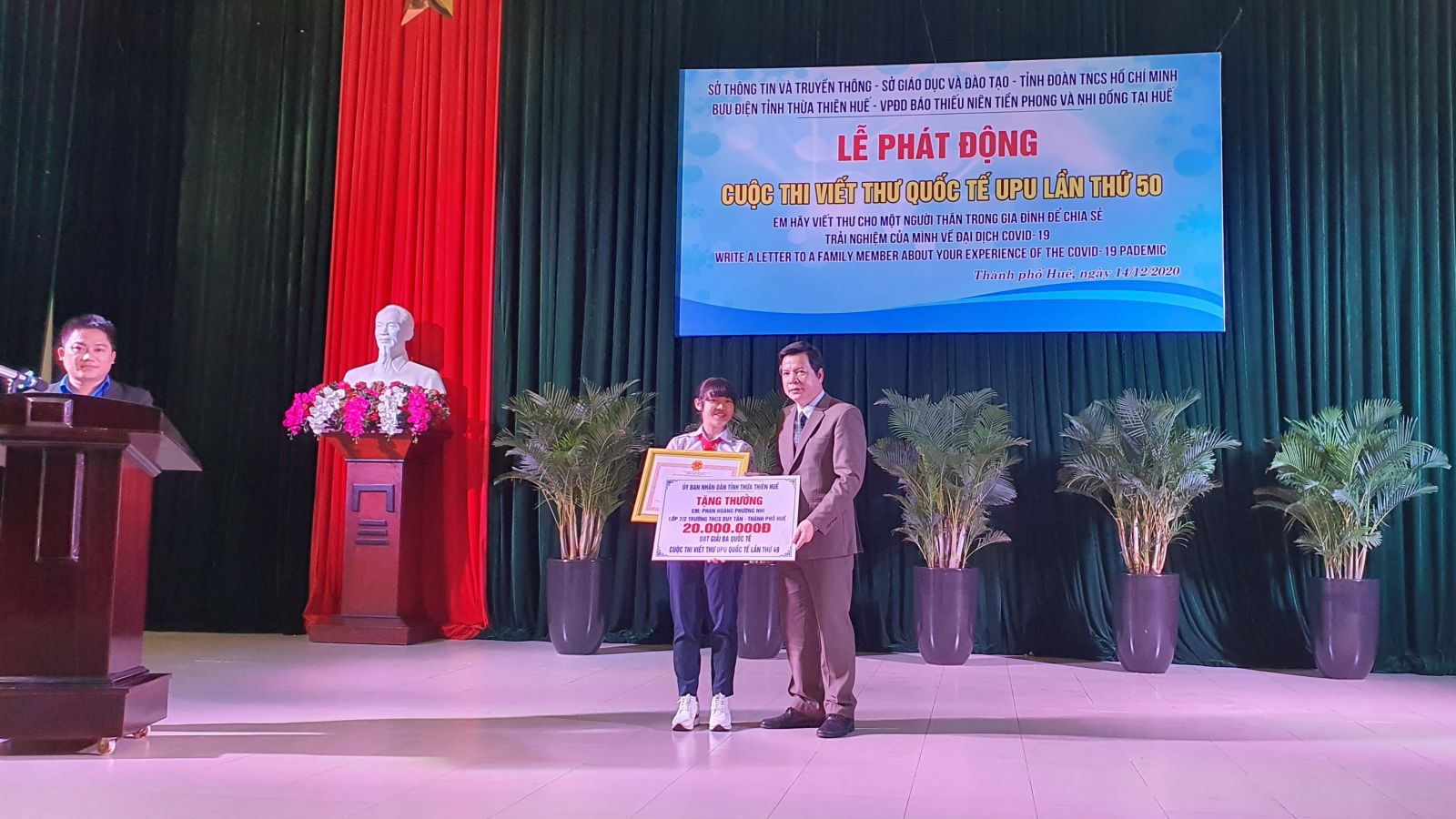 HNN.VN - Ngày 14/12, tại Trường THCS Nguyễn Tri Phương, Sở Thông tin và Truyền thông (TT&TT) phối hợp với Sở Giáo dục và Đào tạo (GD&ĐT), Tỉnh Đoàn, Bưu điện tỉnh; Văn phòng đại diện Báo Thiếu niên Tiền phong và Nhi đồng tại Huế tổ chức lễ phát động cuộc thi viết quốc tế UPU lần thứ 50 (năm 2021). Đây là lần thứ 33 cuộc thi được thi được tổ chức tại Việt Nam.