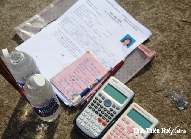 Thẻ dự thi, máy tính, bút... được các thí sinh đem theo để cầu nguyện