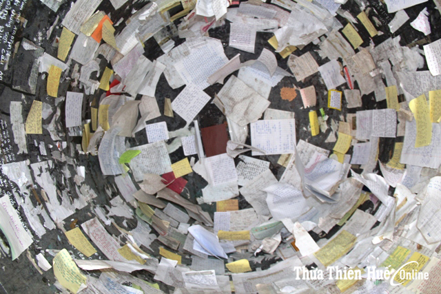 Bên trong chiếc chuông rất nhiều lời cầu nguyện được sĩ tử viết ra giấy và dán lên