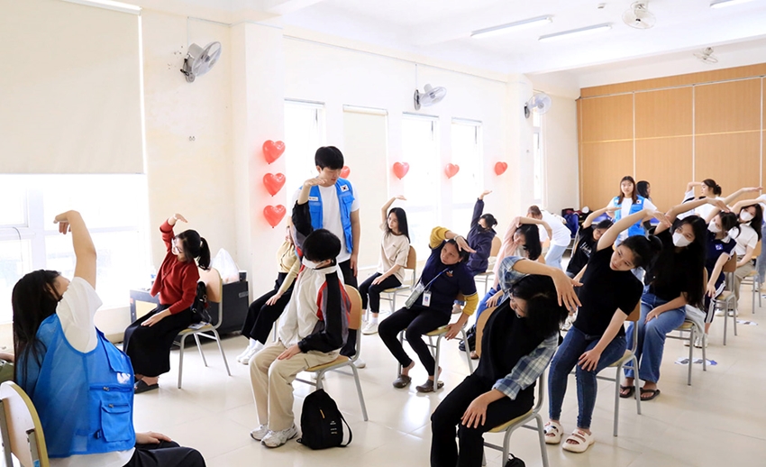 Ngoài ra, sinh viên Trường đại học Ngoại ngữ còn được trang bị các kiến thức, kỹ năng cơ bản về sức khỏe răng miệng, phòng ngừa thoái hóa cột sống, cách rửa tay đúng...