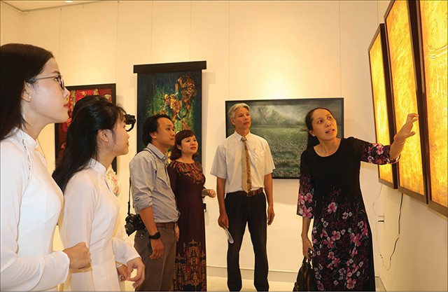 Giới chuyên môn và người yêu nghệ thuật thưởng lãm các tác phẩm tại triển lãm tác phẩm tốt nghiệp của sinh viên
