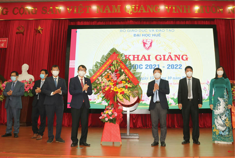 Ông Nguyễn Thanh Bình, UVTV Tỉnh ủy, Phó Chủ tịch UBND tỉnh tặng hoa chúc mừng lễ khai giảng năm học 2021-2022 của Đại học Huế