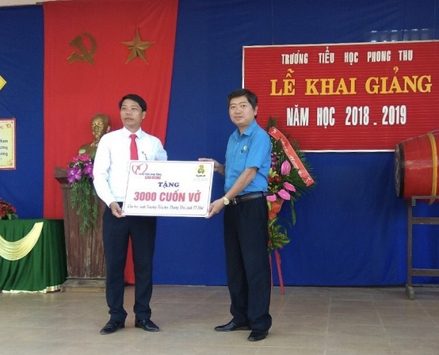HNN.VN - Sáng 5/9, nhân dịp khai giảng năm học mới 2018 - 2019, Liên đoàn Lao động tỉnh phối hợp với Quỹ Xã hội từ thiện Tấm lòng vàng Lao Động đã tổ chức trao tặng vở đến các em học sinh Trường tiểu học Phong Thu, huyện Phong Điền.