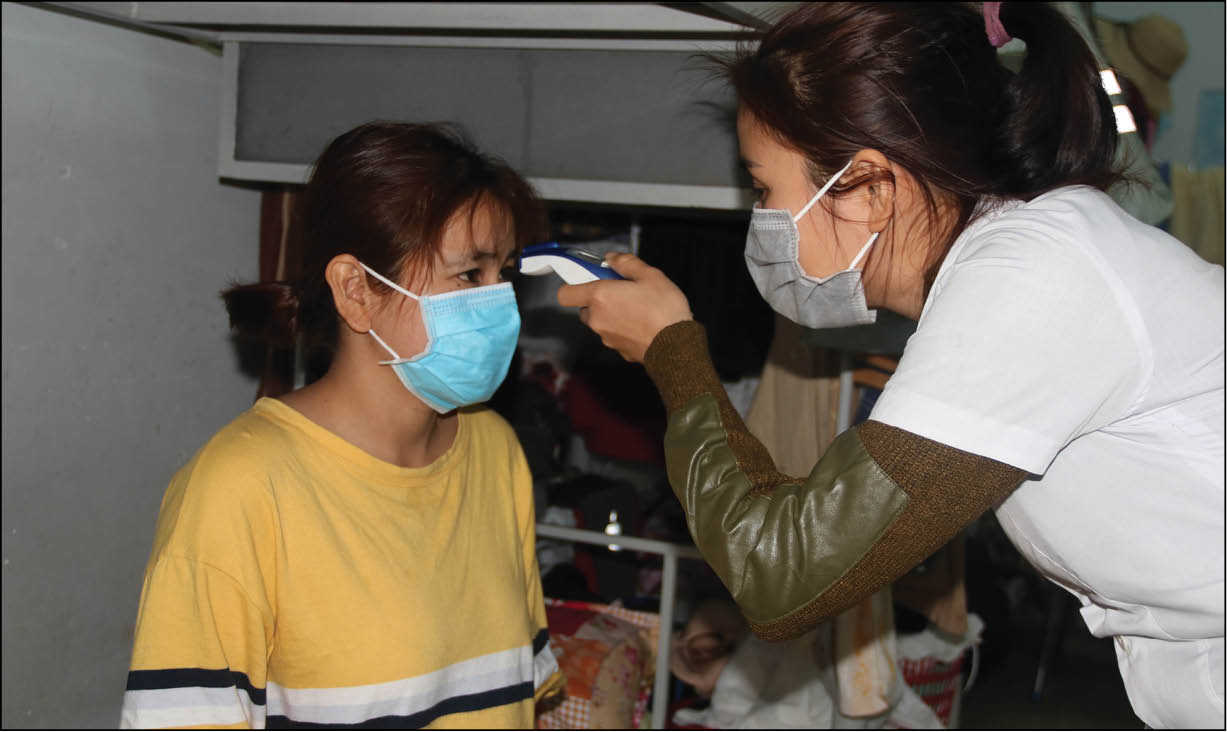 Cán bộ ở KTX Trường Bia đo thân nhiệt cho sinh viên