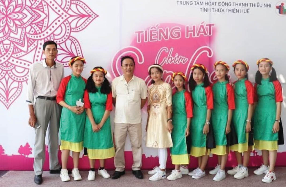 Thầy Biên (ngoài cùng bên trái ) chụp ảnh lưu niệm cùng Câu lạc bộ Âm nhạc sau cuộc thi “Tiếng hát chim sơn ca”