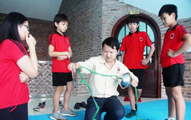 Thầy Vũ trong một tiết hướng dẫn các học sinh làm thí nghiệm từ vật dụng do chính mình sáng chế